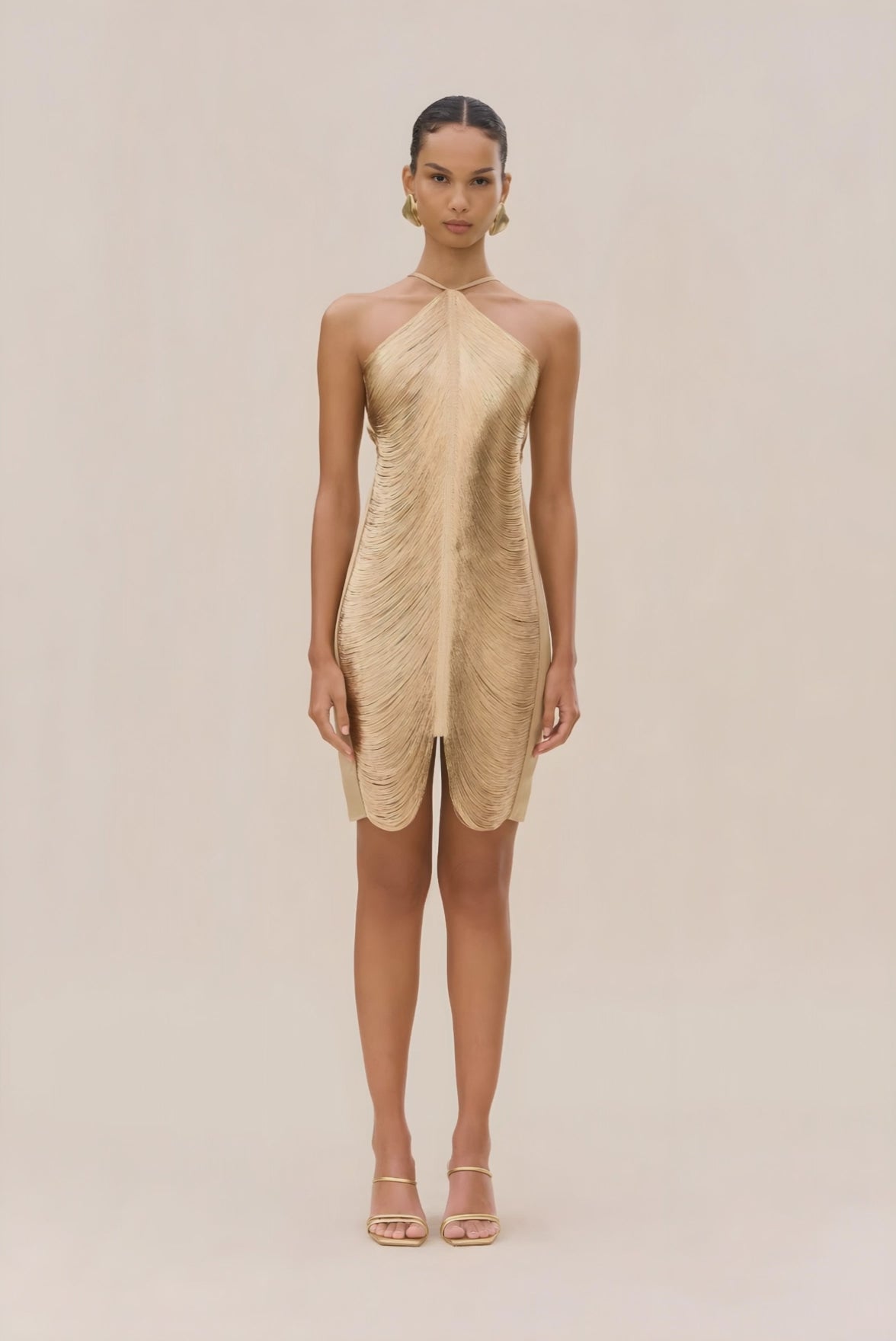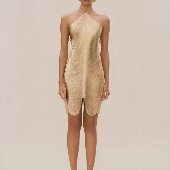 The Mara Dress in Light Gold is crafted for those glow-worthy moments, pairing a fluid drape with a figure-skimming silhouette that moves like light. Its understated lines and radiant hue make you look as captivating as you feel.